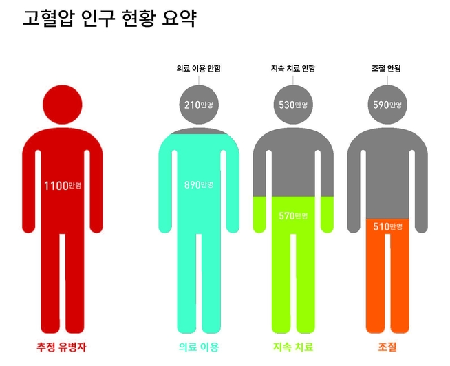 우리나라 대표적인 성인병으로는 당뇨병, 고혈압이 있습니다. 한국의 고혈압 유병자 수는 1,100만 명 이상으로 알려져 있으며, 30세 이상 성인의 4병 중 1명꼴은 고혈압 증상이 있는 것입니다.